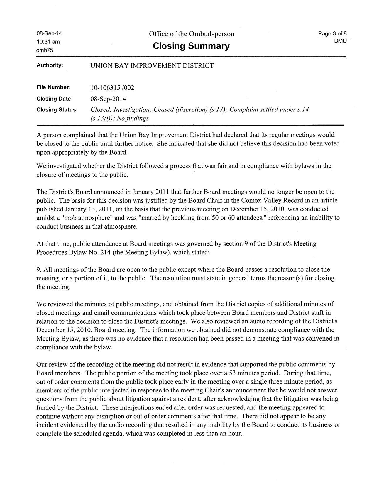 The ministry recognizes the authority and responsibilities of the Union Bay Improvement District as a directly elected local body and continues to support UBID staff with information regarding best practices for the conduct of board meetings and other procedural matters.”